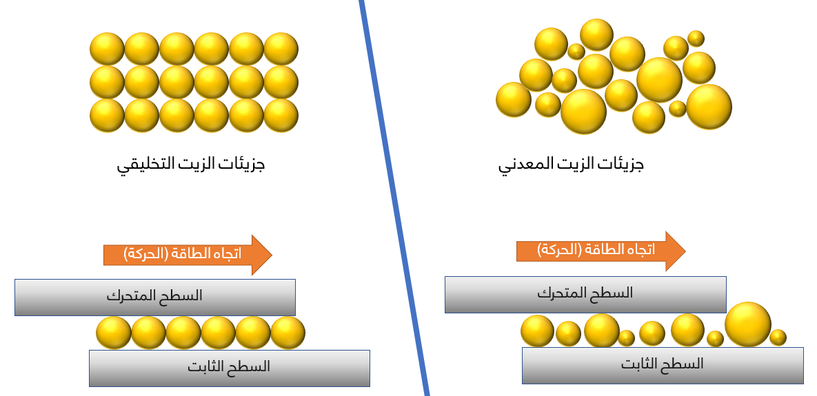 رسم توضيحي يبين الفرق بين الزيت التخليقي والزيت المعدني :